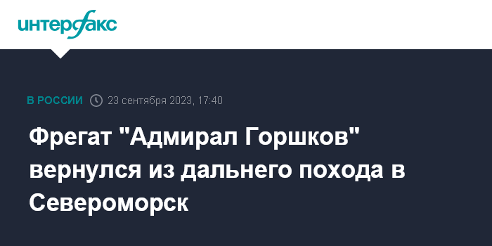 Москва. 23 сентября. INTERFAX.RU - Встреча экипажа фрегата "Адмирал флота Советского Союза Горшков", завершившего выполнение задач дальнего похода, который продолжался 261 сутки, состоялась в субботу в Североморске, сообщила пресс-служба Северного флота.