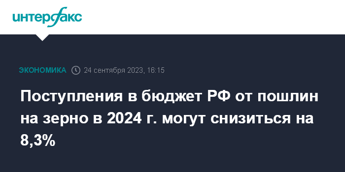 Поступления в бюджет РФ от пошлин на зерно в 2024 г. могут снизиться на 8,3%