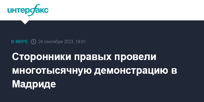 Москва. 24 сентября. INTERFAX.RU - Несколько десятков тысяч демонстрантов провели в воскресенье в Мадриде акцию в поддержку лидера испанских правых Альберто Нуньеса Фейхоо, передают европейские СМИ.