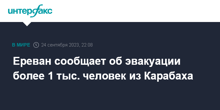 Москва. 24 сентября. INTERFAX.RU - Правительство Армении сообщило об эвакуации из Нагорного Карабаха свыше тысячи местных жителей.