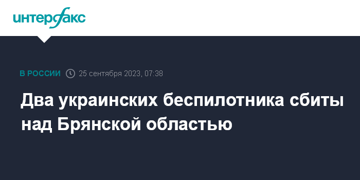 Москва. 25 сентября. INTERFAX.RU - Средства противовоздушной обороны (ПВО) сбили два беспилотника над Суражским районом Брянской области, сообщил губернатор Александр Богомаз.
