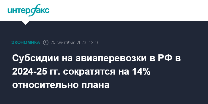 Москва. 25 сентября. INTERFAX.RU - Федеральные субсидии на поддержку авиаперевозок в РФ в ближайшие два года будут меньше на 14% относительно объемов, заложенных на этот период в действующем госбюджете, следует из материалов к проекту бюджета на 2024 год и плановый период 2025-2026 гг., с которыми ознакомился "Интерфакс".