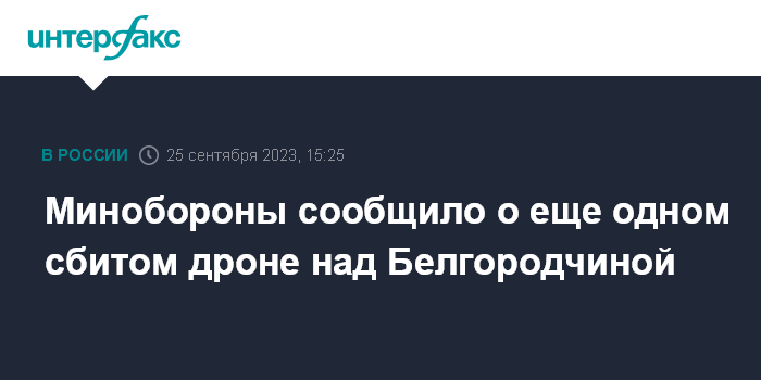 Москва. 25 сентября. INTERFAX.RU - Минобороны России заявило, что над Белгородской областью сбит четвертый за день украинский беспилотник.