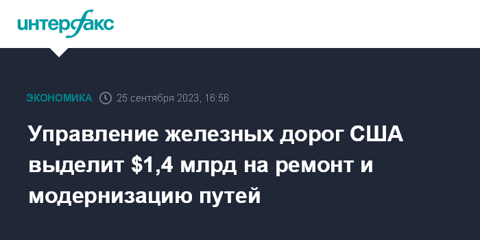 Москва. 25 сентября. INTERFAX.RU - Федеральное управление железных дорог США (FRA) направит грант в $1,4 млрд на ремонт и модернизацию путей для повышения безопасности и увеличения пропускной способности пассажирских и грузовых перевозок, сообщает The Wall Street Journal.