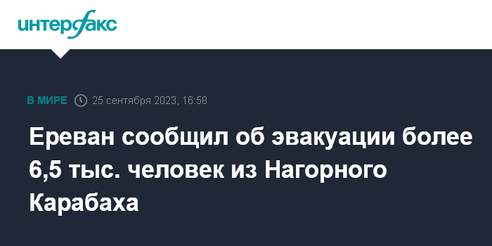 Москва. 25 сентября. INTERFAX.RU - Правительство Армении сообщило об эвакуации из Нагорного Карабаха более 6,5 тыс. местных жителей.