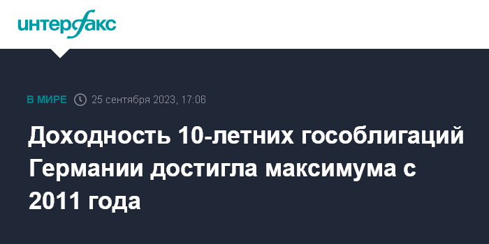 Москва. 25 сентября. INTERFAX.RU - Доходность десятилетних гособлигаций Германии в понедельник поднялась до максимальной отметки с июля 2011 года – выше 2,8% годовых.