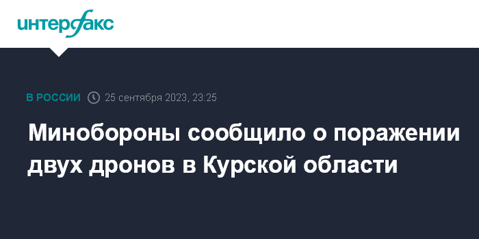 Москва. 25 сентября. INTERFAX.RU - Российские военные заявили, что около 22:30 по Москве сбиты два украинских беспилотника в Курской области.