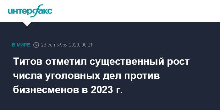 "Хотя регуляторная гильотина и резко сократила количество проверок и административных дел против бизнеса, в уголовной сфере ситуация обстоит иначе. Число уголовных дел по экономическим статьям и статьям о мошенничестве в России продолжает расти. Официальная статистика Генеральной прокуратуры и МВД за первое полугодие 2023 года показывает существенный рост по "экономическим" преступлениям по сравнению с тем же периодом 2022 года", - сказал Титов журналистам.