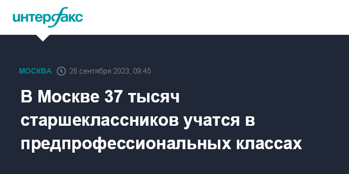 Москва. 26 сентября. INTERFAX.RU - В Москве больше 37 тысяч учеников 10-11-х классов из 360 школ учатся в предпрофессиональных классах, сообщила сайту мэрии и.о. заммэра города Анастасия Ракова.