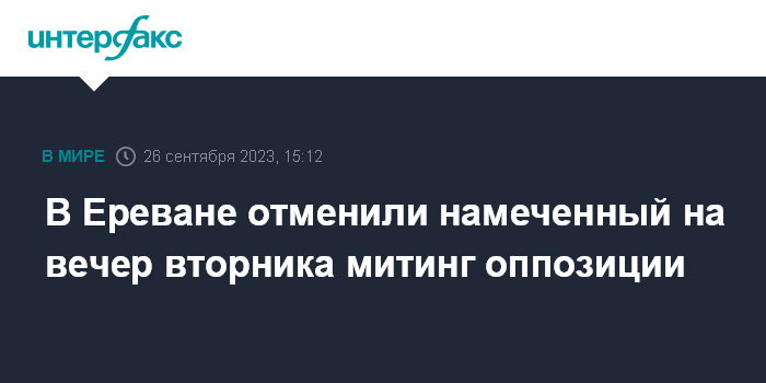 Москва. 26 сентября. INTERFAX.RU - Оппозиция Армении отменила запланированный на вечер вторника митинг в Ереване из-за ситуации в Нагорном Карабахе.