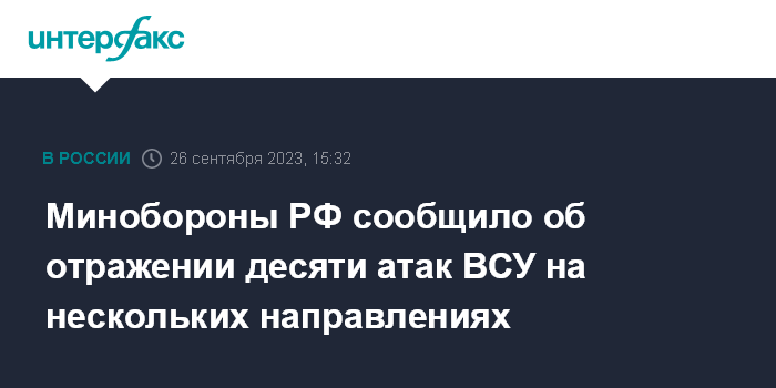 Москва. 26 сентября. INTERFAX.RU - Российские военные отразили четыре атаки вооруженных сил Украины (ВСУ) на донецком направлении, три - на красно-лиманском, две - на запорожском и одну на южно-донецком, заявил официальный представитель Минобороны РФ Игорь Конашенков.