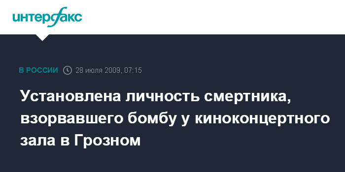 Ростов-на-Дону. 28 июля. ИНТЕРФАКС-ЮГ - Установлена личность боевика, который привел в действие взрывное устройство возле киноконцертного зала в Грозном, сообщили агентству "Интерфакс-Юг" в правоохранительных органах.