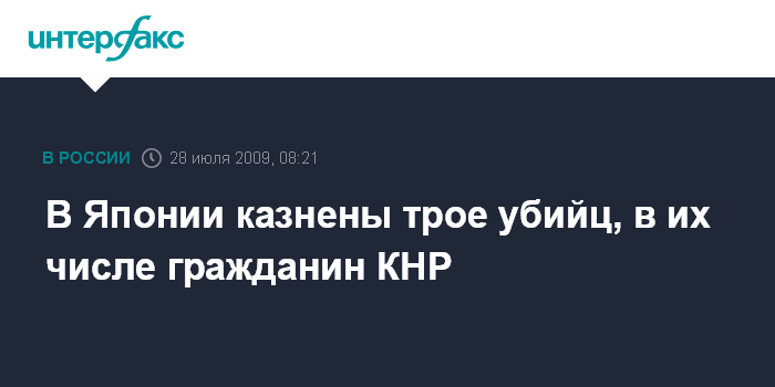 Москва. 28 июля. INTERFAX.RU - Двое подданных Японии и один гражданин Китая казнены во вторник в японских городах Токио и Осаке, сообщает министерство юстиции Японии.