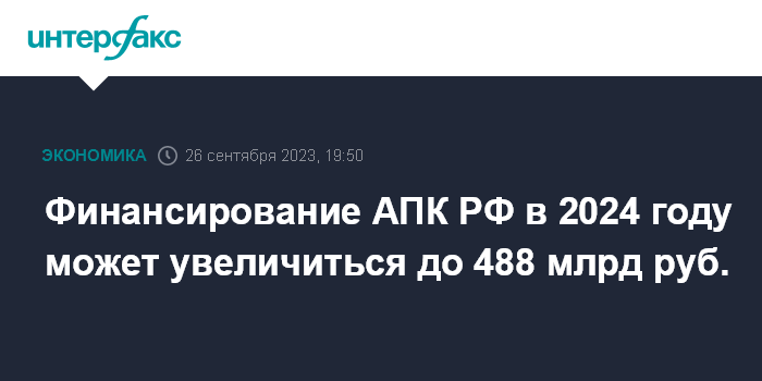 Москва. 26 сентября. INTERFAX.RU - Финансирование АПК РФ в следующем году предусмотрено в сумме 488 млрд рублей, говорится в проекте федерального бюджета на 2024 год и плановый период 2025-2026 годов, с которым ознакомился "Интерфакс".