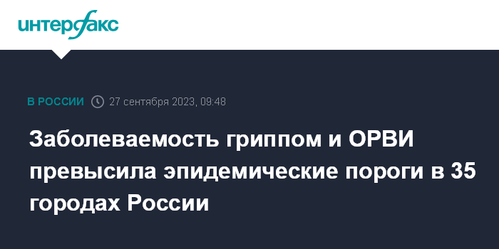 Москва. 27 сентября. INTERFAX.RU - Заболеваемость гриппом и ОРВИ в России превысила эпидемические пороги на 20% в 35 городах страны, сообщил журналистам главный внештатный специалист Минздрава России по инфекционным болезням Владимир Чуланов.