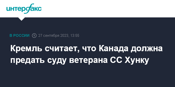 Песков также сказал, что в Канаде должны предать суду 98-летнего украинского ветерана Ярослава Хунку, который, как выяснилось позже, во время Второй мировой войны сражался на стороне нацистов.