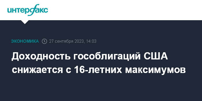 Москва. 27 сентября. INTERFAX.RU - Доходность государственных облигаций США в среду опускается с 16-летних максимумов, достигнутых накануне.