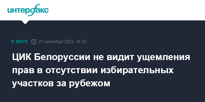 Москва. 27 сентября. INTERFAX.RU - Отсутствие избирательных участков за границей не ущемляет права белорусских граждан, находящихся за пределами страны, они могут приехать голосовать в Белоруссию, заявил глава Центризбиркома республики Игорь Карпенко на заседании комиссии. Об этом сообщает "БелТА".