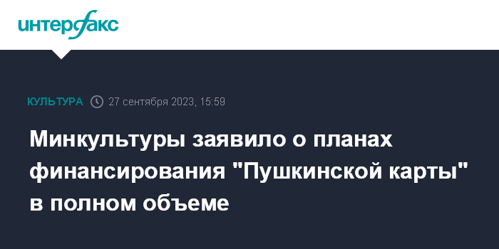 25 сентября стало известно, что финансирование программы "Пушкинская карта" в 2024-2025 годах предлагается сократить в общей сложности почти на 8 млрд рублей. Это следовало из пояснительной записки к проекту бюджета на 2024 год и плановый период 2025-2026 годов, с текстом которой ознакомился "Интерфакс".