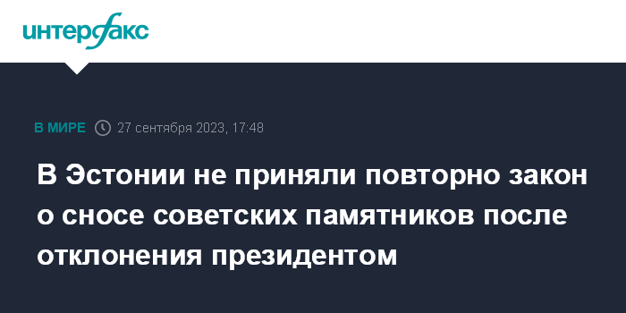 Москва. 27 сентября. INTERFAX.RU - Парламент Эстонии на заседании решил не принимать повторно закон о сносе "красных памятников", отклоненный ранее президентом Аларом Карисом.