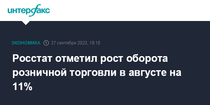 Москва. 27 сентября. INTERFAX.RU - Оборот розничной торговли в России в августе 2023 года в годовом выражении вырос на 11%, сообщил Росстат. Результат оказался лучше консенсус-прогноза "Интерфакса", который предполагал рост показателя на 10,6%.