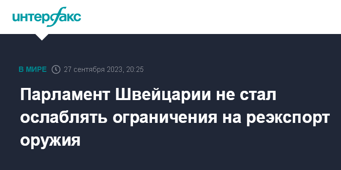 Москва. 27 сентября. INTERFAX.RU - Нижняя палата Федерального собрания Швейцарии в среду проголосовала против снятия запрета на реэкспорт швейцарского оружия в страны, которые находятся в состоянии военного конфликта, сообщает сайт Национального совета Конфедерации.