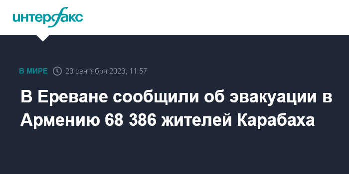 Москва. 28 сентября. INTERFAX.RU - В Армению из Нагорного Карабаха въехали 68 386 жителей региона, сообщила в соцсетях пресс-секретарь премьер-министра Армении Назели Багдасарян.