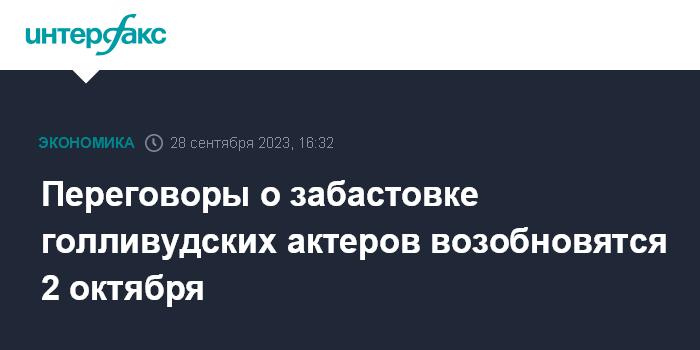 Москва. 28 сентября. INTERFAX.RU - Профсоюз SAG-AFTRA, объединяющий около 160 тысяч голливудских актеров, 2 октября возобновит переговоры с киностудиями о прекращении забастовки и заключении нового рабочего соглашения, сообщает NBC News.