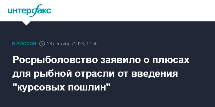 Москва. 28 сентября. INTERFAX.RU - Введение "курсовых пошлин" не повлияет на объемы экспорта рыбной продукции из РФ. Эта мера может сделать более конкурентоспособной цену на рыбу на внутреннем рынке, считает руководитель Росрыболовства Илья Шестаков.