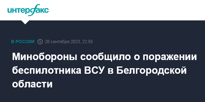 Москва. 28 сентября. INTERFAX.RU - Минобороны РФ сообщило, что около 21:00 сбит украинский дрон в Белгородской области.