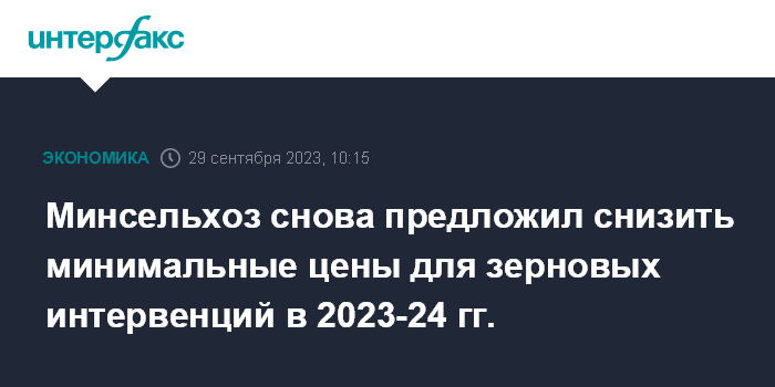 Москва. 29 сентября. INTERFAX.RU - Минсельхоз РФ в очередной раз предлагает снизить минимальные цены, при достижении которых в 2023-2024 гг. возможно проведение закупочных и товарных интервенций на рынке зерна.