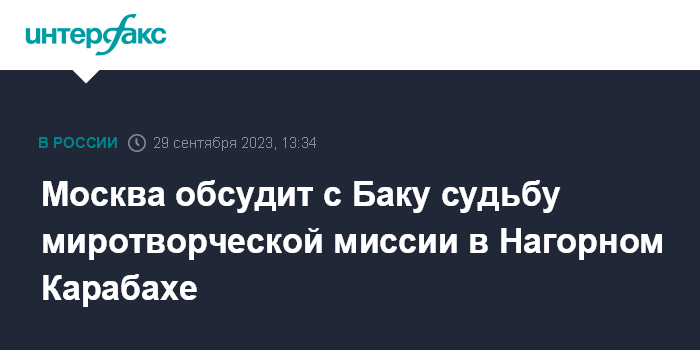 Москва. 29 сентября. INTERFAX.RU - В Кремле заявили, что дальнейшая судьба российского миротворческого контингента в Нагорном Карабахе будет предметом обсуждений с Баку.