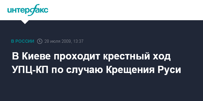 Москва. 28 июля. INTERFAX.RU – Представители Украинской православной церкви Киевского патриархата (УПЦ-КП) во вторник проводят крестный ход по случаю празднования Крещения Киевской Руси.