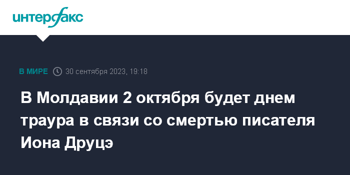 Москва. 30 сентября. INTERFAX.RU - В Молдавии 2 октября объявлен Днем национального траура в связи с кончиной классика молдавской литературы Иона Друцэ. Как сообщила "Интерфаксу" пресс-служба президента, указ об этом подписала в субботу президент Майя Санду.
