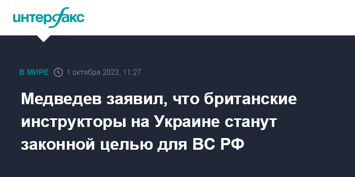 Москва. 1 октября. INTERFAX.RU - Перемещение на территорию Украины британских инструкторов для подготовки украинских солдат сделает их законной целью для российских военных, заявляет зампредседателя Совета безопасности РФ Дмитрий Медведев.