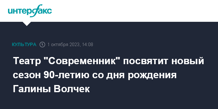 Москва. 1 октября. INTERFAX.RU - Московский театр "Современник" посвятит новый театральный сезон 90-летию со дня рождения Галины Волчек, сообщил директор театра Юрий Кравец.