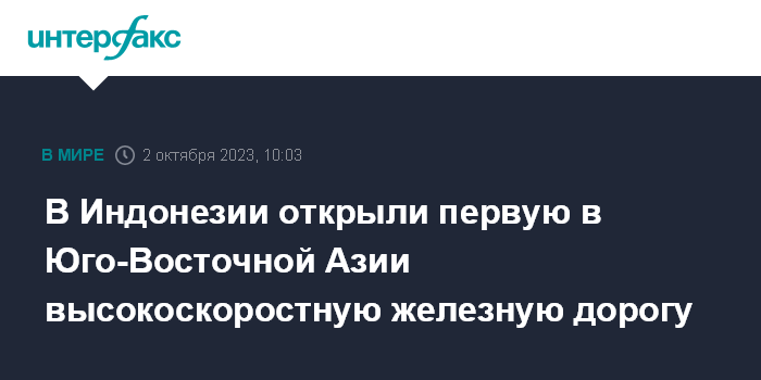 Москва. 2 октября. INTERFAX.RU - Президент Индонезии Джоко Видодо на торжественной церемонии открыл железнодорожный путь, по которому будет ходить первый в Юго-Восточной Азии высокоскоростной поезд, сообщает АР. Агентство отмечает, что проект стоимостью $7,3 млрд в значительной мере финансировался Китаем.