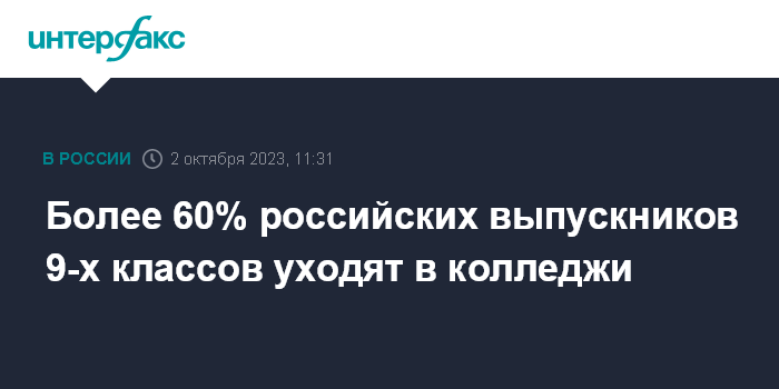 Москва. 2 октября. INTERFAX.RU - Более 60% учеников 9-х классов выбирают обучение в колледжах в 2023 году, сообщила вице-премьер Татьяна Голикова на всероссийском конкурсе "Мастер года".