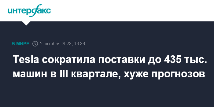 В июле-сентябре Tesla поставила на мировой рынок 435 059 машин против 466 145 кварталом ранее.