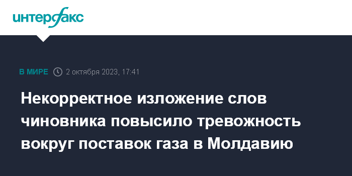 Москва. 2 октября. INTERFAX.RU - Некорректное изложение слов молдавского чиновника повысило тревожность вокруг поставок газа в Молдавию.