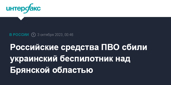 Москва. 3 октября. INTERFAX.RU - Российские средства противовоздушной обороны (ПВО) сбили украинский беспилотник над Трубчевским районом Брянской области, сообщил губернатор региона Александр Богомаз.