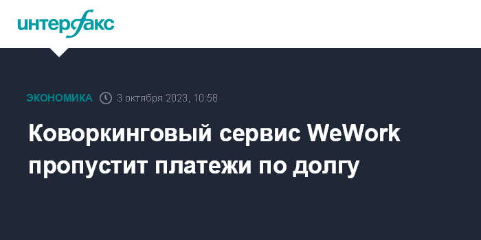 Москва. 3 октября. INTERFAX.RU - Американский коворкинговый сервис WeWork Inc. сообщил, что пропустит процентные платежи по долгу в размере около $95 млн и обсудит варианты реструктуризации задолженности с кредиторами.