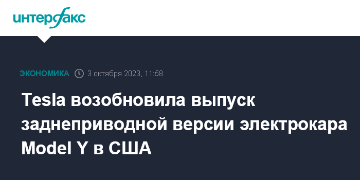 Москва. 3 октября. INTERFAX.RU - Американский производитель электромобилей Tesla возобновил производство заднеприводной комплектации кроссовера Model Y в США и будет продавать ее по более низкой цене, сообщает MarketWatch.