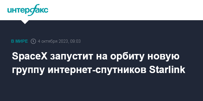 Москва. 4 октября. INTERFAX.RU - Ракета-носитель Falcon 9 в четверг по московскому времени будет запущена на орбиту с очередной партией из 22 мини-спутников для пополнения орбитальной группировки глобальной сети интернет-покрытия системы Starlink, сообщила компания-разработчик ракеты SpaceX.