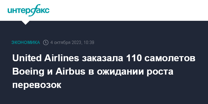 Москва. 4 октября. INTERFAX.RU - Американская холдинговая компания United Airlines Holdings, материнская структура United Airlines, заказала в общей сложности 110 самолетов у Boeing Co. и Airbus SE в связи с ожидаемым увеличением спроса на авиаперевозки, сообщает MarketWatch.