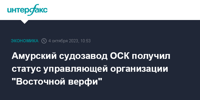 Москва. 4 октября. INTERFAX.RU - ПАО "Амурский судостроительный завод" (АСЗ, входит в ОСК) получило статус управляющей организации, которая будет осуществлять полномочия единоличного исполнительного органа АО "Восточная верфь" (Владивосток), говорится в сообщении АСЗ.