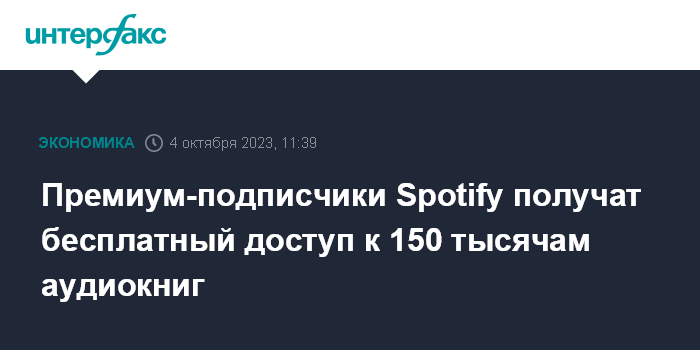 Москва. 4 октября. INTERFAX.RU - Шведская Spotify Technology, оператор одноименного музыкального стримингового сервиса, сообщила об открытии бесплатного доступа к 150 тысячам аудиокниг для владельцев премиальной подписки, сообщает MarketWatch.