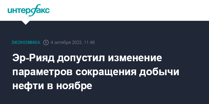 Москва. 4 октября. INTERFAX.RU - Саудовская Аравия сохраняет планы по добровольному сокращению добычи нефти в 1 млн б/с до конца 2023 года, но может пересмотреть его параметры в ноябре, сообщило государственное агентство королевства со ссылкой на источник в Министерстве энергетики.