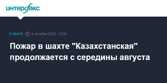 Москва. 4 октября. INTERFAX.RU - В Карагандинской области с 17 августа продолжается пожар на угольной шахте "Казахстанская" АО "АрселорМиттал Темиртау", сообщили агентству "Интерфаксу" в пресс-службе МЧС Казахстана.