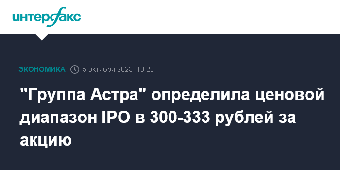 Москва. 5 октября. INTERFAX.RU - ПАО "Группа Астра" (головная структура группы IT-компаний "Астра", занимающихся разработкой инфраструктурного ПО, включая операционную систему Astra Linux) определила ценовой диапазон IPO на "Московской бирже" в 300-333 рублей за акцию, говорится в сообщении компании.